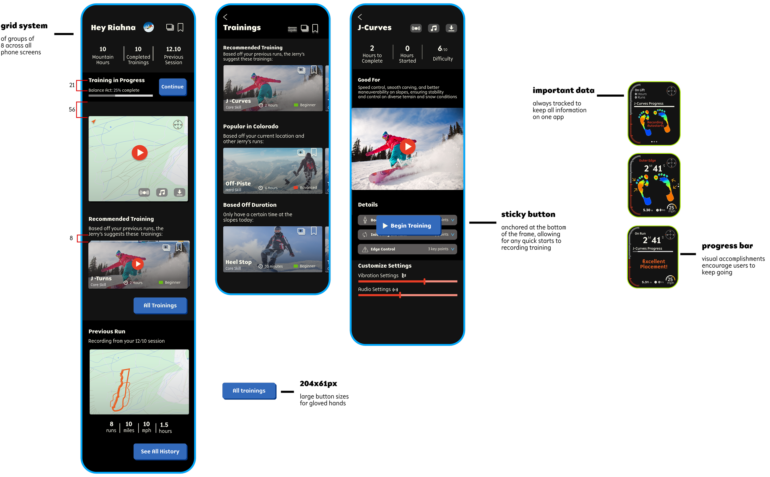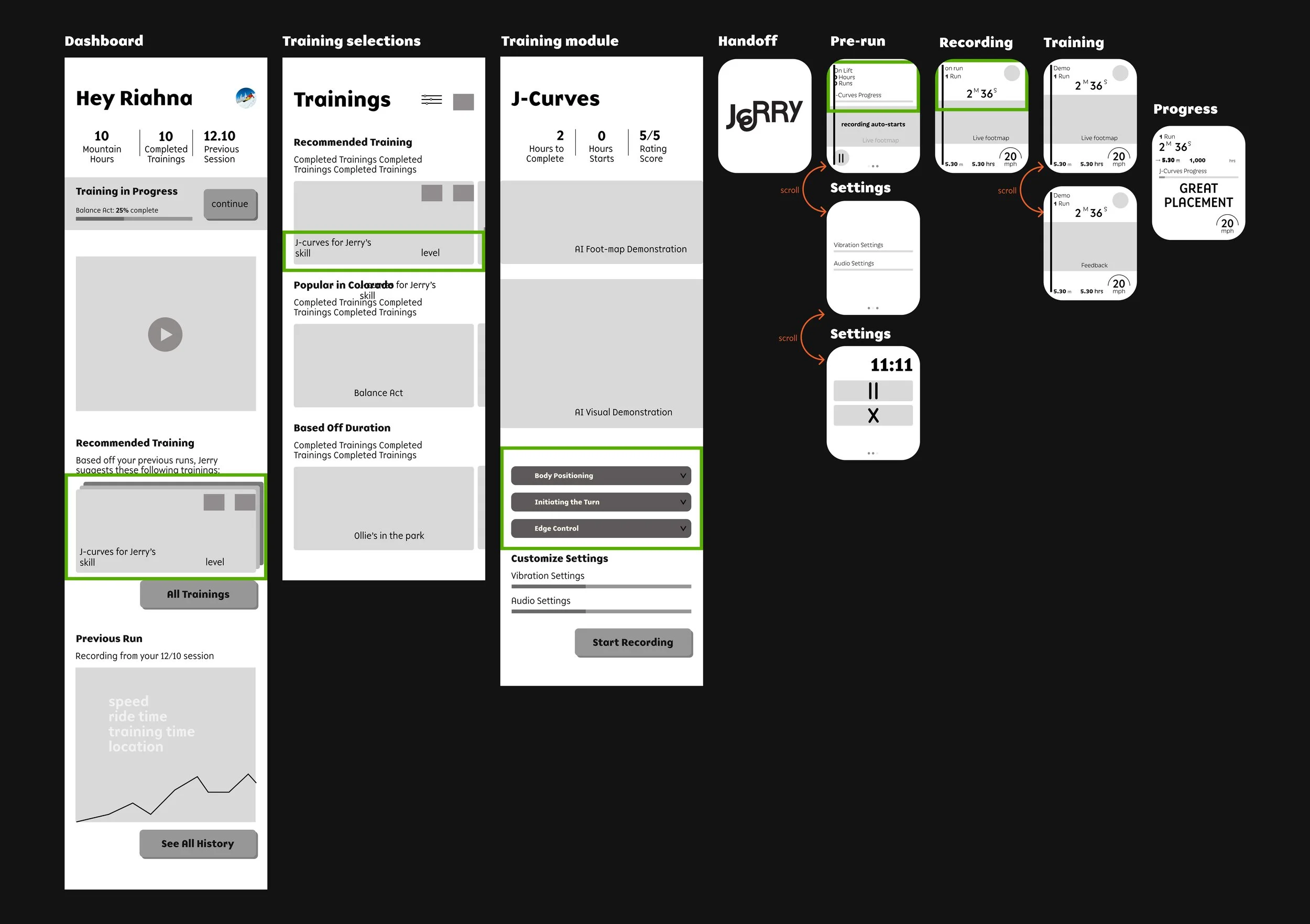 On the slopes, users receive feedback through vibrations, so they can stay focused without needing to check their phone, and can gain visual feedback via their watches interface. Designing in dark mode allows for better contrast in snowy environments, ensuring Jerry is easy to read at a glance.