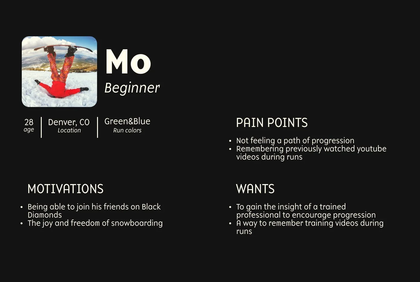 The typical user bases for Jerry includes beginner snowboarders who are more prone to injuries due to a lack of proper, consistent training and those facing the high costs of lessons. Many of these beginners are part of a younger, digitally-native demographic that prefers learning through technology-driven platforms. This group values real-time feedback, personalized progress tracking, and social engagement, all of which are not adequately provided in traditional snowboarding lessons. Additionally, those who turn to social media for advice often lack the proper feedback mechanisms to improve their techniques, further hindering their progress and increasing injury risks.